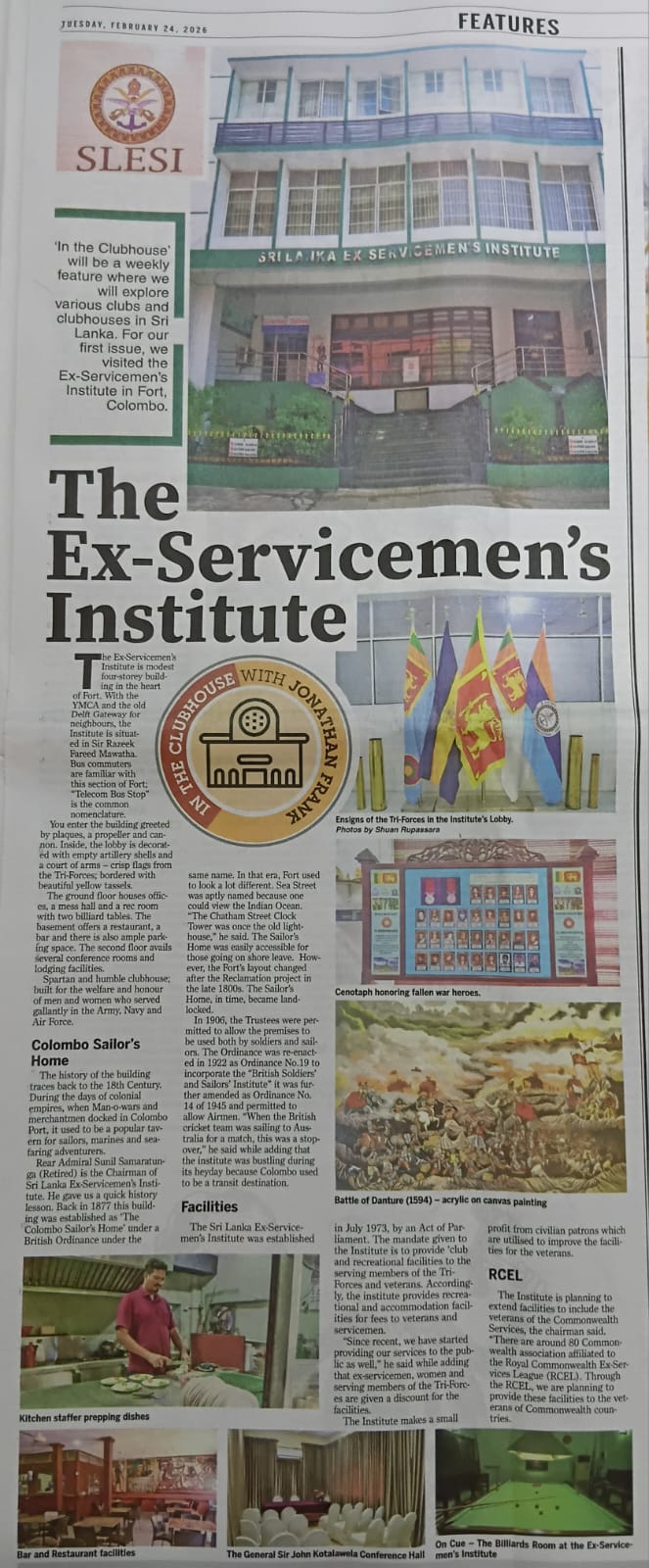 The Sri Lanka Ex- Servicemen’s Institute SLESI known as the “Home of the Brave Veterans” has a rich history, having originated as way back as 1877 enacted by an ordinance as “The Colombo Sailors Home”. With the passage of time, the British soldiers and airmen were also allowed to use the facilities provided by the Institute. The present Sri Lanka Ex- Servcemen Institute was established by an act of Parliament in February 1973.